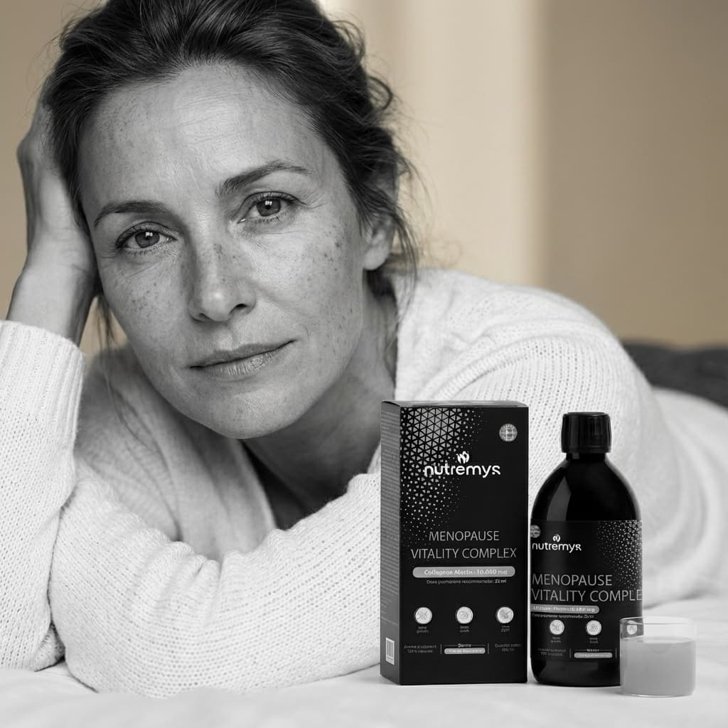 Menopause Vitality Complex es el suplemento líquido premium de Nutremys creado para acompañarte en cada etapa de la perimenopausia y menopausia. Su fórmula avanzada combina 10.000 mg de colágeno marino, vitaminas esenciales, minerales, ácido hialurónico, CoQ10 y un exclusivo Balance Blend con plantas adaptógenas y fitoestrógenos cuidadosamente seleccionados.